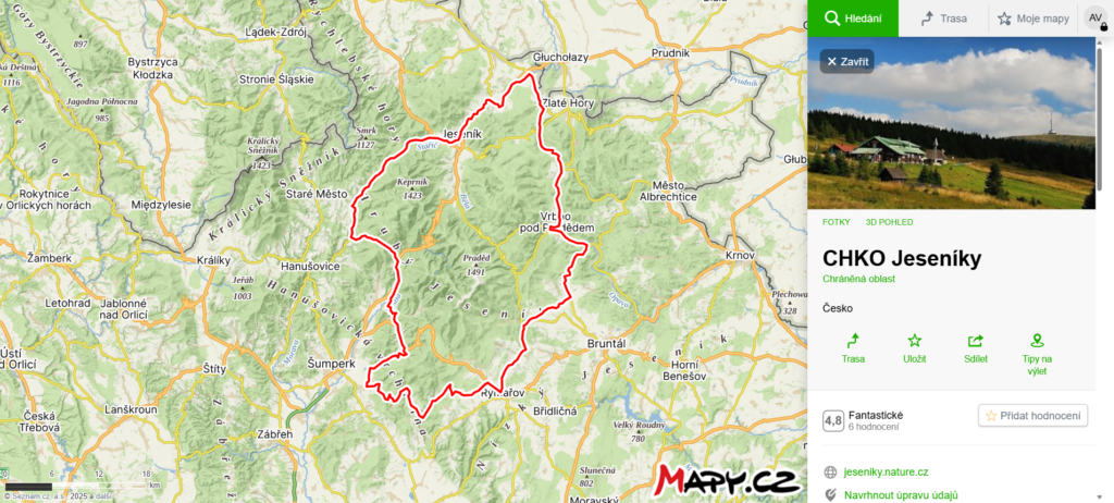 - Popis: Trasa vede z Ramzové přes Šerák, Keprník, Červenohorské sedlo až na Praděd. Nabízí nádherné výhledy a celodenní putování po hlavním hřebeni.