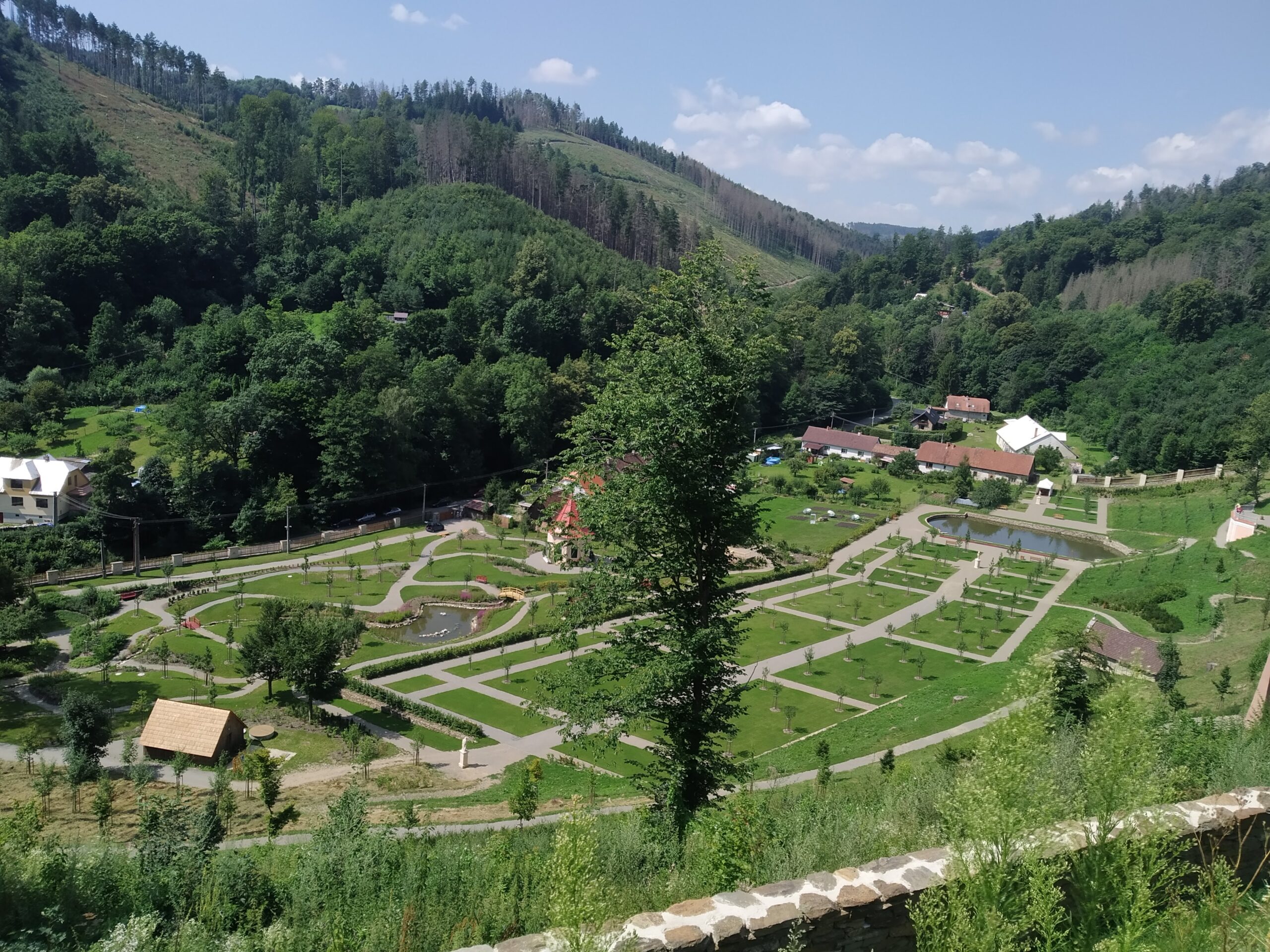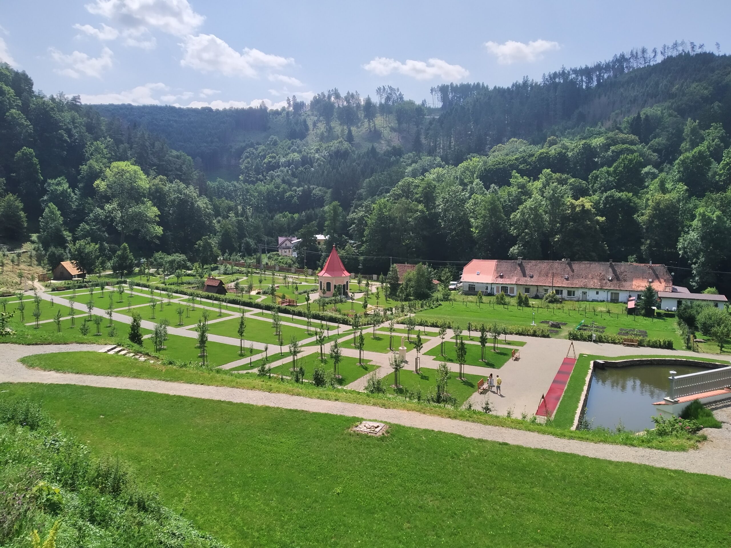 Romantická zahrada se zdobenými terasami a okrasnými záhony.