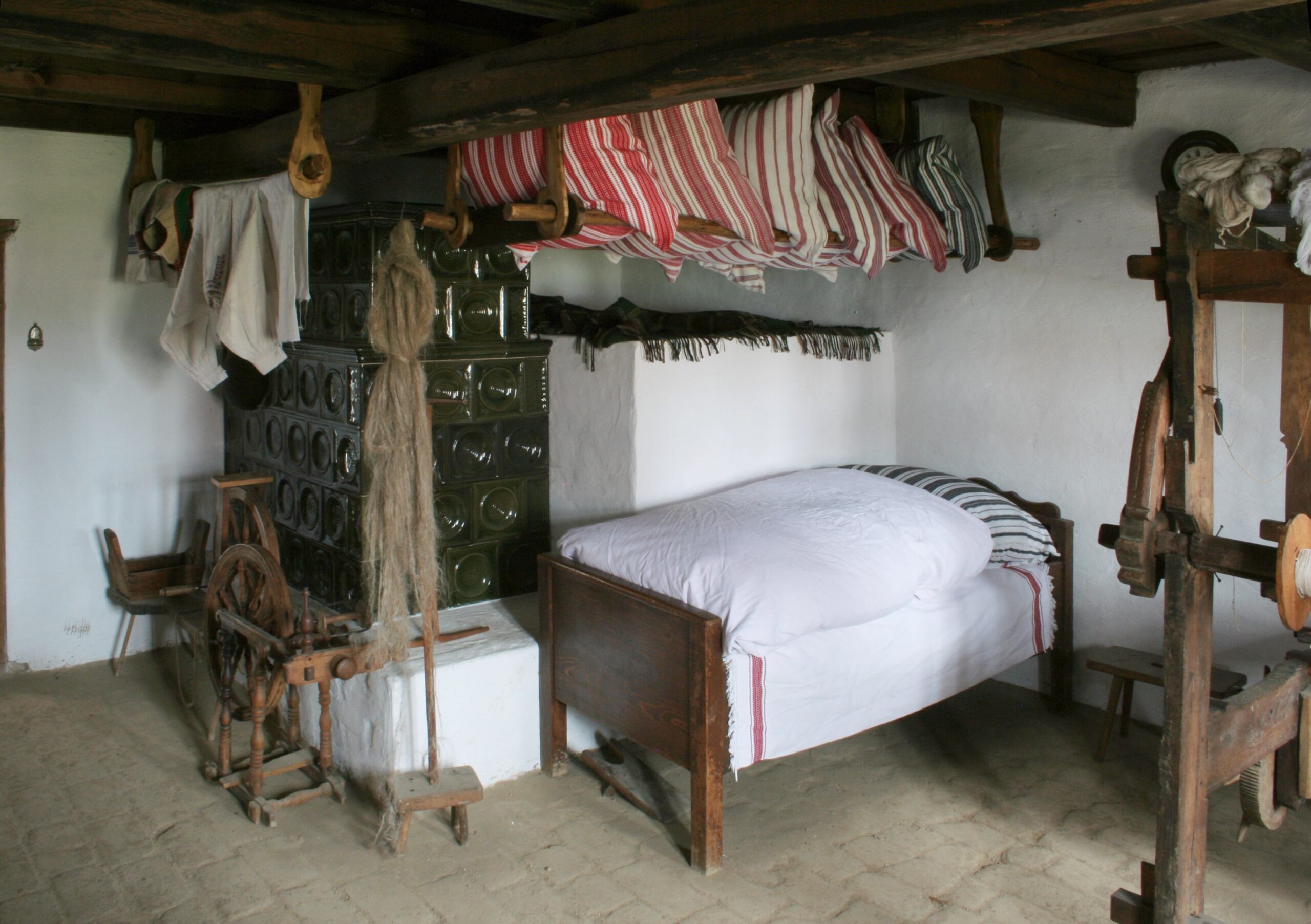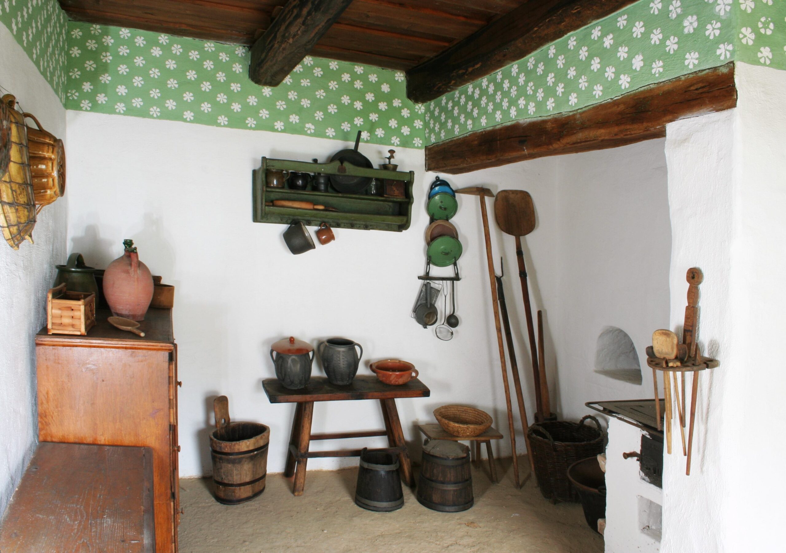 Největší pozornost přitahují roubené a hliněné domy se slaměnými střechami, ukázky lidového nábytku, vybavení domácností i starobylých technologií, např. vodní mlýn, valcha, vodní pila, ale také luční seníky či vinné sklepy.