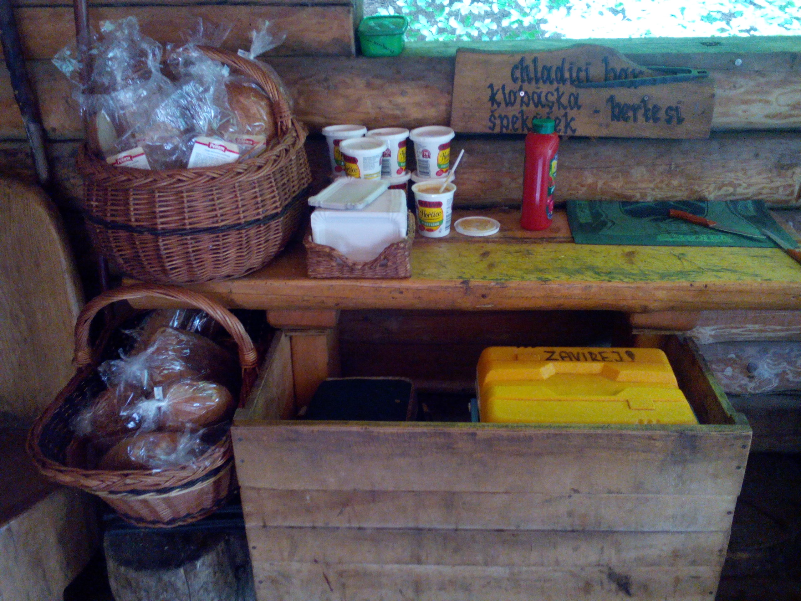 Všechno je tu připravené – dřevo, opékací „pichláky“, hořčice, chleba i buřty v chladicím boxu.