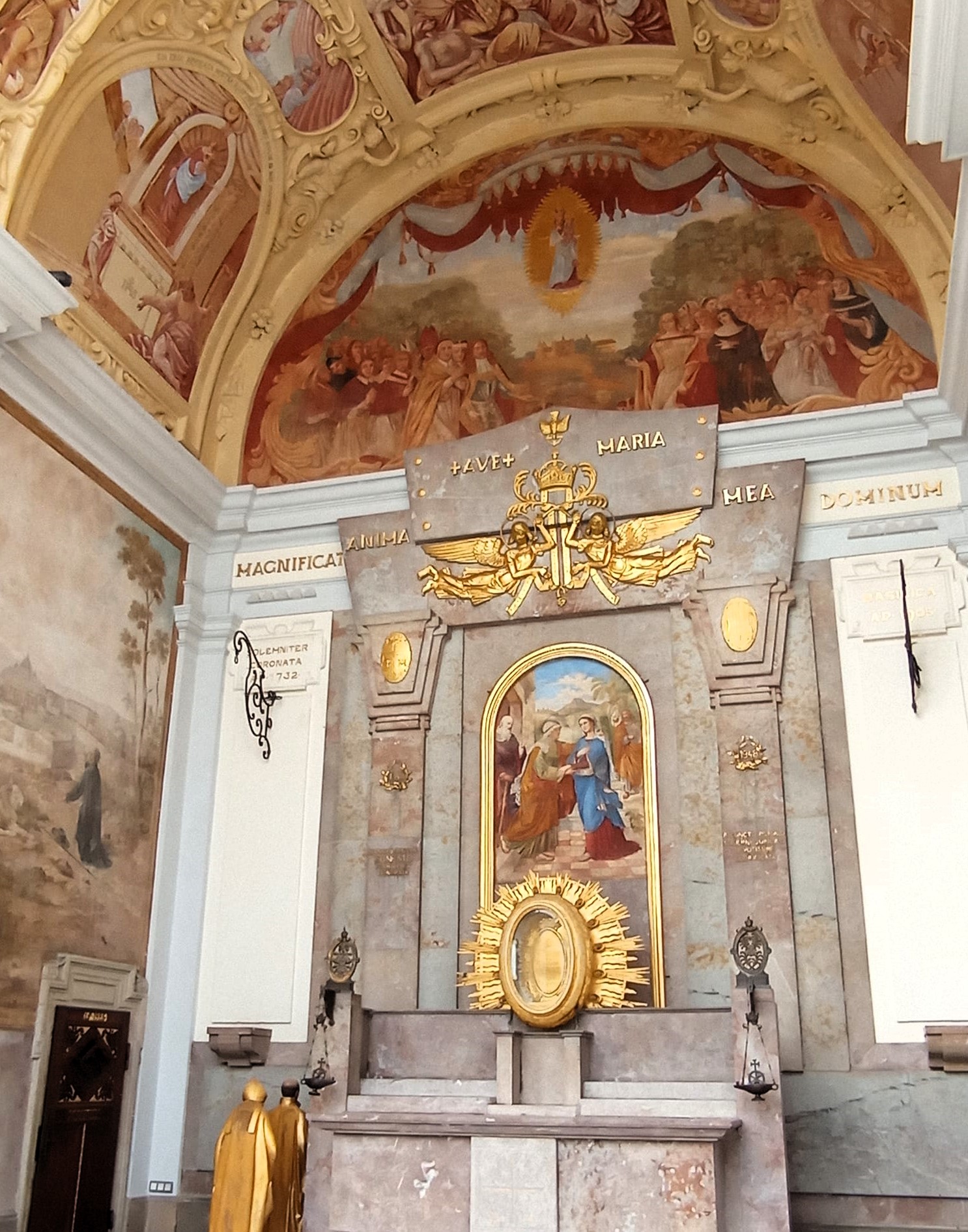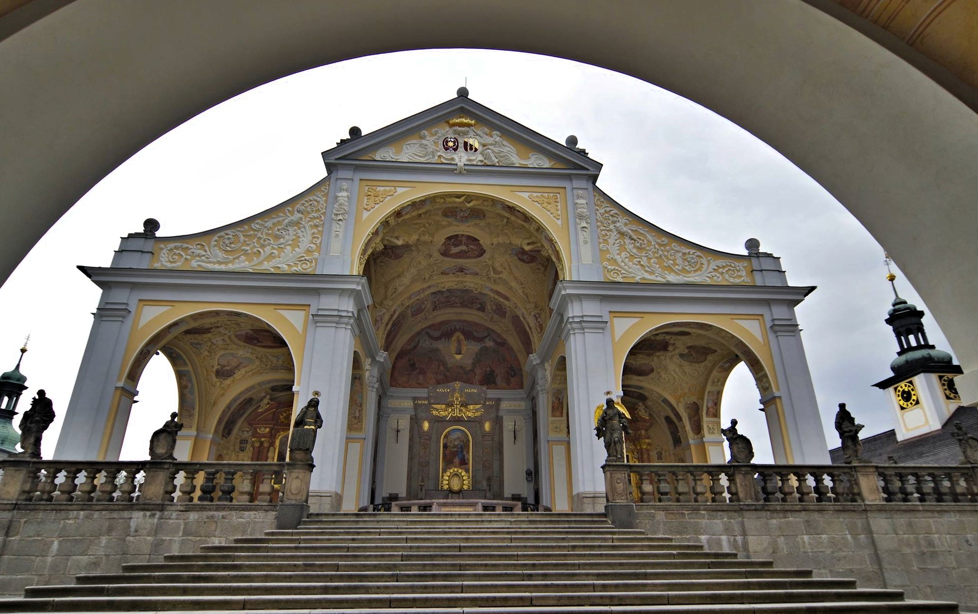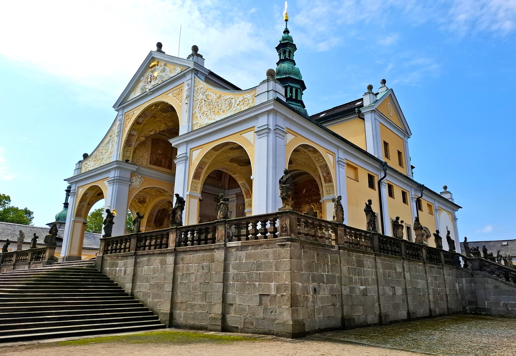 Dominantou areálu je bazilika Nanebevzetí Panny Marie, která se nachází na vyvýšené terase obklopené ambity s kaplemi a bohatou výzdobou. Celý komplex působí harmonicky, vyváženě a zároveň monumentálně – přesně tak, jak si barokní architekti představovali ideální poutní místo.