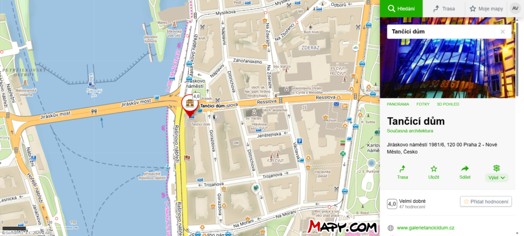 Tančící dům se nachází na rohu Rašínova nábřeží a Jiráskova náměstí, jen pár kroků od centra Prahy. V jeho bezprostřední blízkosti najdete: